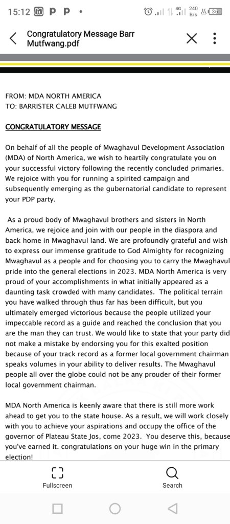 The Mwaghavul Development Association felicitates with Barr. Caleb Mutfwang for his emergence as the PDP gubernatorial flag bearer.
