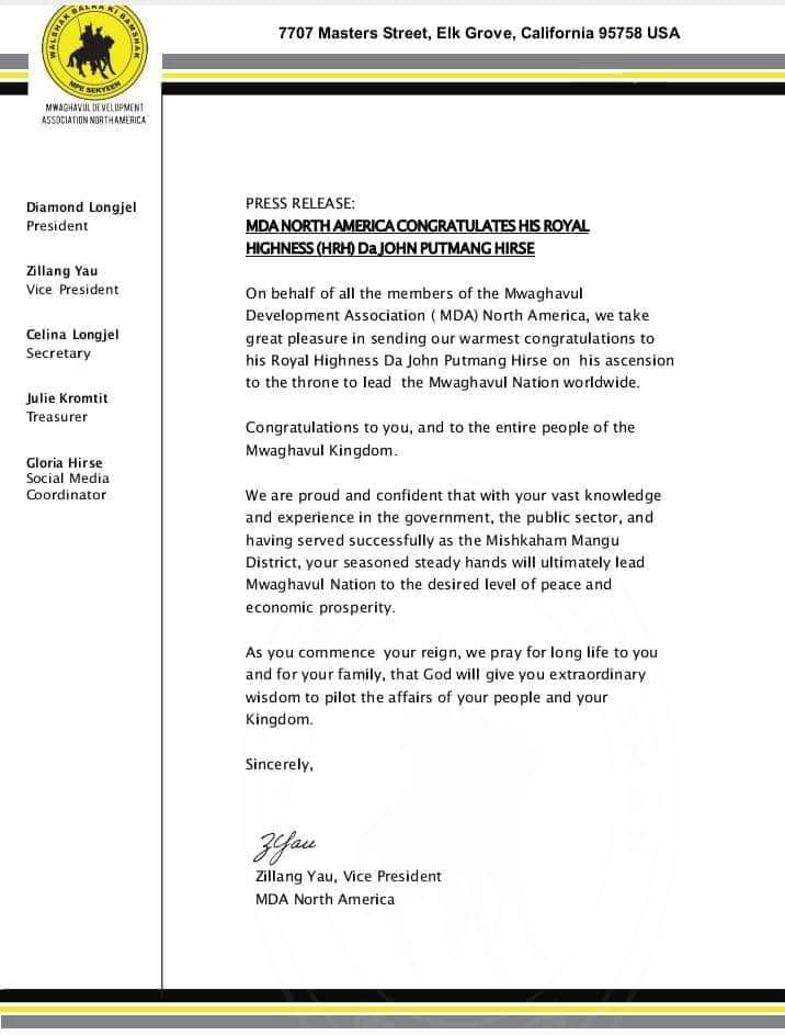 The Mwaghavul Development Association (MDA) North America Branch has congratulated His Royal Highness Da John Putmang Hirse over his emergence as the Paramount Ruler of the Mwaghavul Nation world wide. In a statement signed by the Vice President Zillang Yau and made available to this medium, the association also congratulated the entire Mwaghavul Nation over his successful emergence.